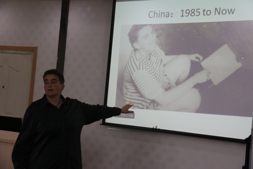 讲座伊始,Clare以一个外国游客的形象进入会场,假装迷路,用英语向在场的师生问路,当有人用流利的英文回答Clare的问题时,Clare露出十分惊讶的表情。随后,Clare向大家解释,当她三十年前初来中国之时,会说英文的中国人少之又少,大多情况下她都是靠肢体语言和别人沟通。而如今,语言障碍则不再存在。三十年后,重返中国,让Clare感受到了中国翻天覆地的变化。
