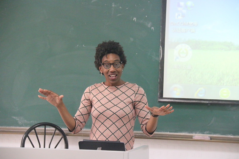 15号下午Salt博士做了题为“Frederick Douglass, Marie Vieux Chauvet and the Re-making of American Literature”(弗莱德里克·道格拉斯,玛丽·维科斯·肖威,以及美国文学的重构)的讲座。她以两位族裔作家为例,分析了在美国文学的建构中个体声音、形象、个体体验的塑造、记录、与书写的重要性。Salt博士介绍了自己求学的1980年代,美国大学文学课程中异军突起的族裔文学、性别研究、文化研究、女性文学、社会政治理论等诸多新理论视角,以及对形成自己的研究方向的重要影响。讲座结尾处,Salt博士援引Edwidge Danticat的文本,鼓励每位学子勇于发出自己的声音,书写自己的生命体验,以汇入人类总体文本的洪流。