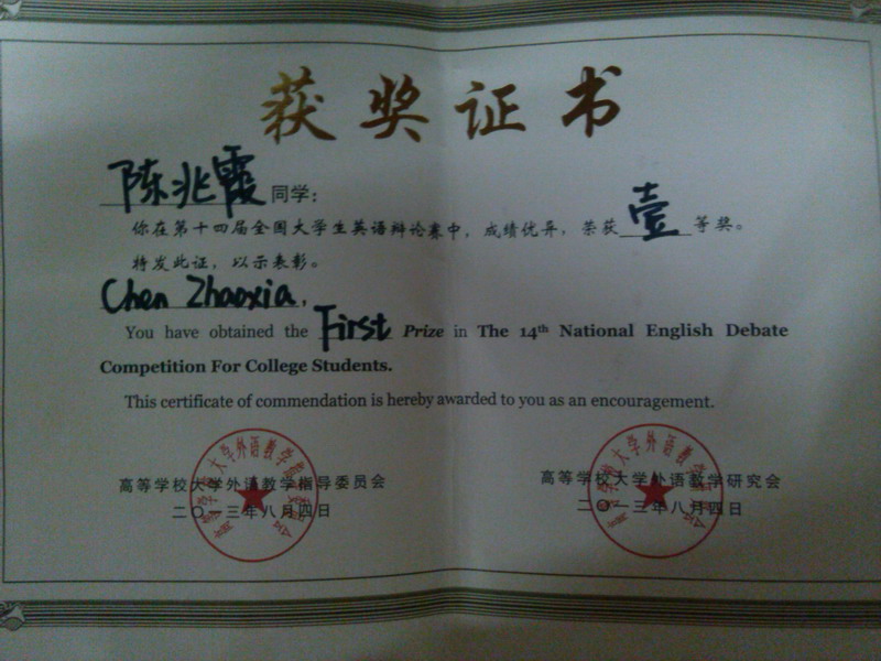 陈兆霞同学在此次活动中以第一名的成绩荣获第十四届全国大学生英语演讲比赛一等奖,并获得第十四届全国大学生英语辩论赛一等奖。