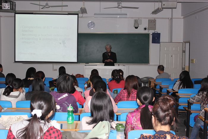 师生做了题为“Constructing a Life in ELT”的学术讲座。她通过对比语言、教学、学习、文化和研究这五个因素在传统和现代外语教学中的异同,阐明这些因素的变化对现代外语教学和研究的意义。同时,就如何发现并研究外语教学中的问题以及如何撰写学术论文,做了深入透彻而清晰的分析,使在座师生受益匪浅。