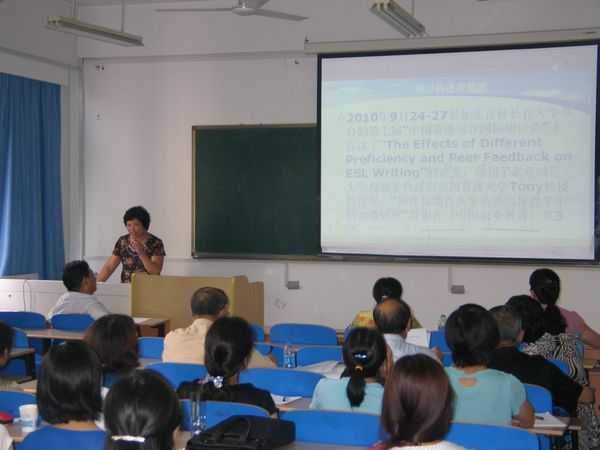 是学校人文社科项目最多的学院,每位汇报人都精心制作了丰富多彩、图文并茂的PPT课件。汇报围绕各自的容(开题报告或在研进展情况)进行了汇报。整场汇报在热烈的研讨气氛中展开,汇报结束后,督导专家做了点评,提出了选题的重要性,鼓励教师从国家亟需、市场需求,以及兴趣等方面来进行创新;朱世桂也根据这次项目的具体情况,提出了意见和建议,希望老师们今后能围绕语言学研究拓展深化,加强研究内涵和深度。景桂英代表学院感谢科技处领导和督导组专家,鼓励在研项目的老师珍惜机会,认真完成立项和结题的工作。