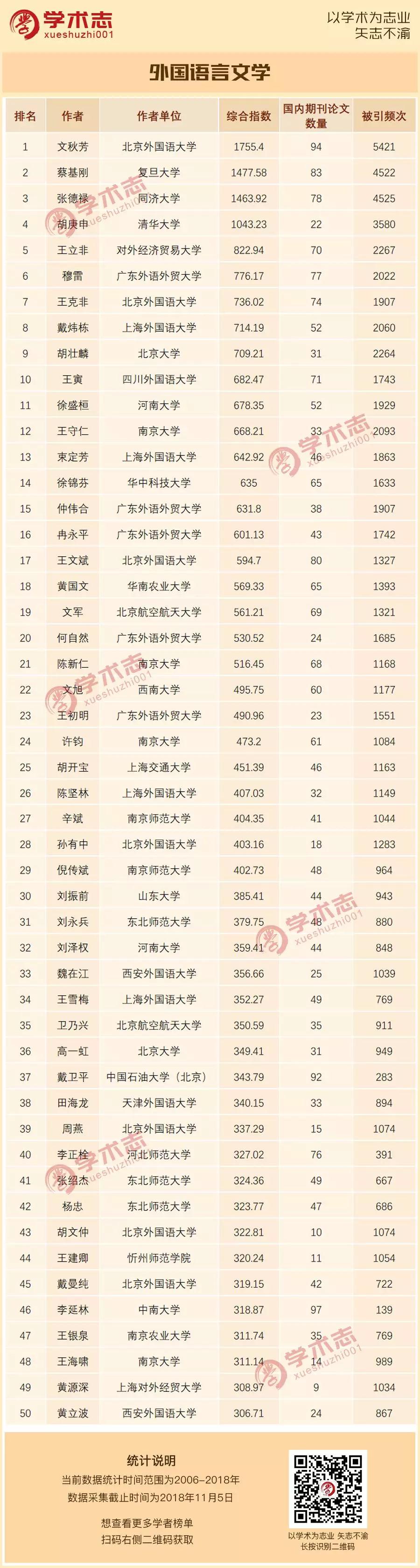 该榜单以教育部2011年《学位授予和人才培养学科目录》与《中国图书馆图书分类法》(第五版)为基础,结合高校院系专业设置,将文献划分为13个学科门类、103个一级学科和359个二级学科,整理了各学科10余年来学者的发文情况,选取哲学、社会学、经济学、艺术学、法学、政治学、民族学、马克思主义理论、教育学、心理学、体育学、中国语言文学、外国语言文学、新闻传播学、考古学、中国史、世界史、工商管理、农林经济、公共管理、图书情报与档案等学科综合指数排名前50名的学者。综合指数是考量了论文数量和被引频次两个指标的综合指标,反映了该学者在本学科的学术影响力与传播力,统计数据来自《中国高校科技成果统计分析数据库》,统计方法和结果具有较高的权威性。
