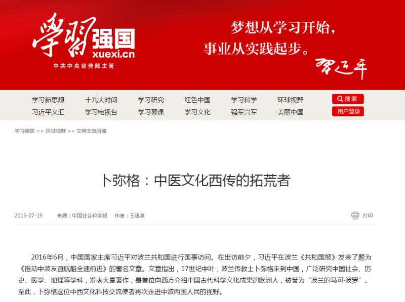 王银泉的文章指出,20166,中国国家主席习近平对波兰共和国进行国事访问。在出访前夕,习近平在波兰《共和国报》发表了题为《推动中波友谊航船全速前进》的署名文章。文章指出,17世纪中叶,波兰传教士卜弥格来到中国,广泛研究中国社会、历史、医学、地理等学科,发表大量著作,是首位向西方介绍中国古代科学文化成果的欧洲人,被誉为“波兰的马可·波罗”。至此,卜弥格这位中西文化科技交流使者再次走进中波两国人民的视野。