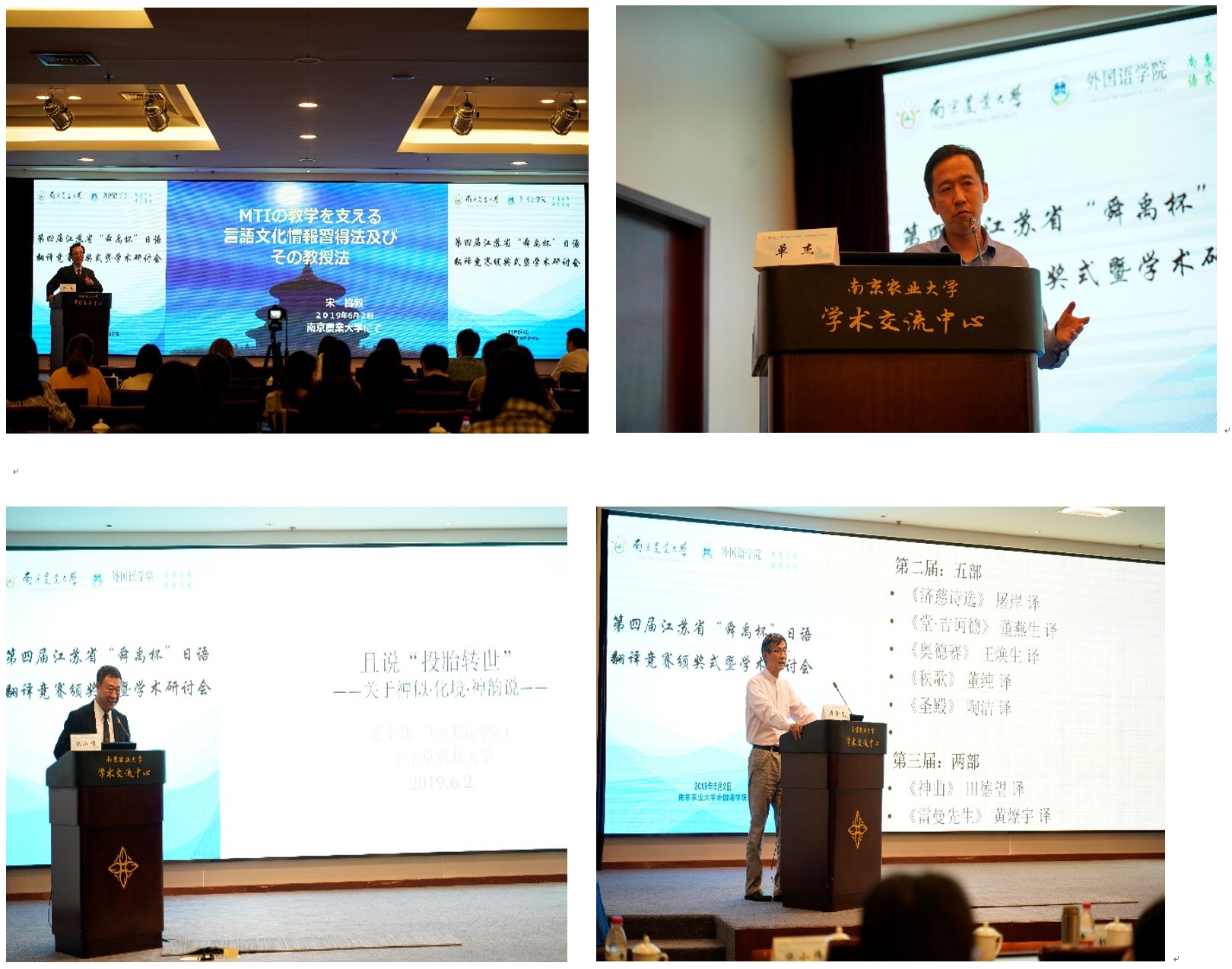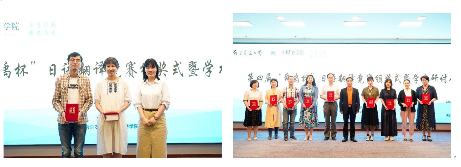 研讨会结束后,举行了隆重的颁奖仪式,日语系金锦珠老师代表评审组汇报了第四届江苏省“舜禹杯”日语翻译竞赛的评审情况后,游衣明公布了最终获奖终结果。据悉,第四届江苏省“舜禹杯”日语翻译竞赛于2019年1月启动,在控制稿件数量的前提下,3月底截稿时共收到江苏省内26所高校和省外19所高校寄来参赛译文共计409篇,其中日译汉303篇,汉译日106篇,参赛者均是中文为母语的在校大学生或研究生。4月份经过翻译界专家及评委的匿名评审,共评选出入围稿件日译汉30篇、汉译日10篇。6月1日对入围同学进行现场加试,在紧张的专家现场评审之后,综合初赛成绩,评选出汉译日、日译汉的各级奖项及优秀组织奖(获奖名单见下表)。我校日语专业研究生于博川获日译汉特等奖,任红磊获汉译日一等奖。
