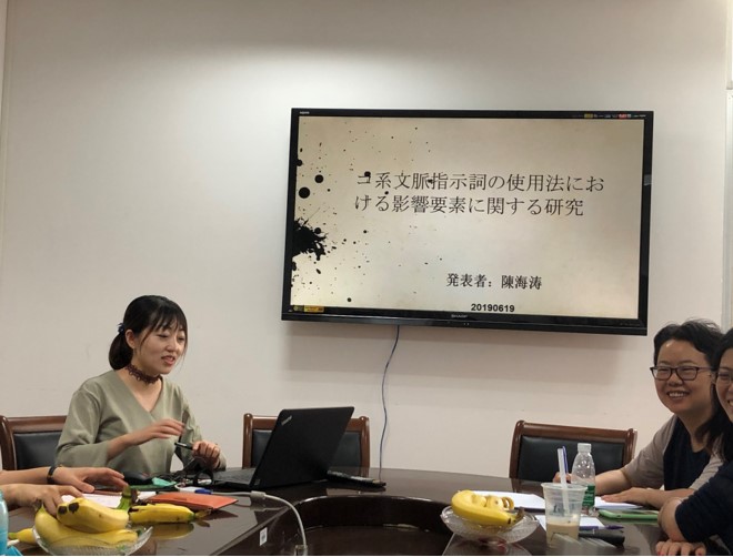 另外,陈海涛老师就博士期间的主要研究成果《コ系文脈指示詞の使用法における影響要素に関する研究》进行了发表。作为语言学研究的成果,コ系文脈指示詞一直是学术界备受争论和关注的研究点。陈海涛老师通过问卷调查及其他定性研究方法,就之前学术界的反例进行了深入分析和探讨。刘青老师和陈海涛老师的汇报既是自身研究成果的交流,同时为今后的基础日语的教学提供了很好素材。