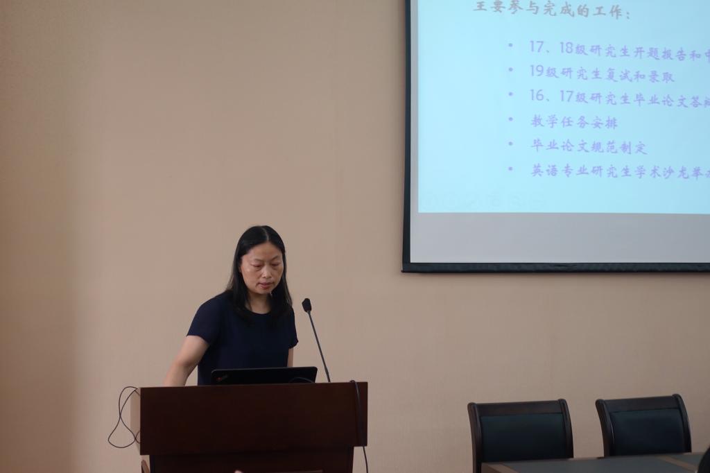 本次会议分两个阶段进行。会议第一阶段由学院学术委员会主任王银泉教授主持。英语和日语两个二级学科点负责人裴正薇教授和李红教授分别就两个学科的建设发展作了汇报交流。李红教授就麻豆视频