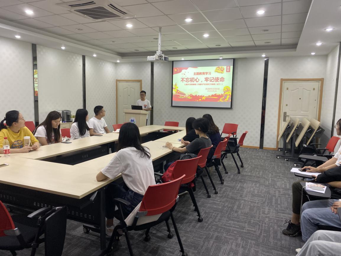 英语研究生支部在教学楼A310围绕“不忘初心、牢记使命”主题教育的专题开展学习。会上,支部书记刘维杉强调了作为党员提高思想理论学习的重要性,同时要求学生党员应该有理想、有本领、有担当,时刻以严格标准要求自己,争做新时代的合格党员。