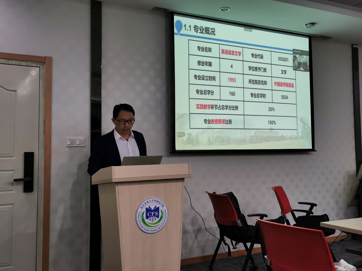 曹新宇致简短开幕词之后,英语系系主任李平教授从专业概况、学科支撑、人才培养、建设亮点、建设思路和预期成果六个方面介绍了英语专业近年来在专业建设方面所做的工作和取得的成果。