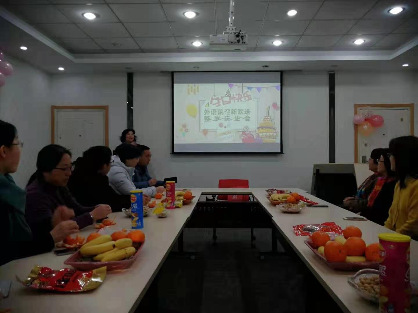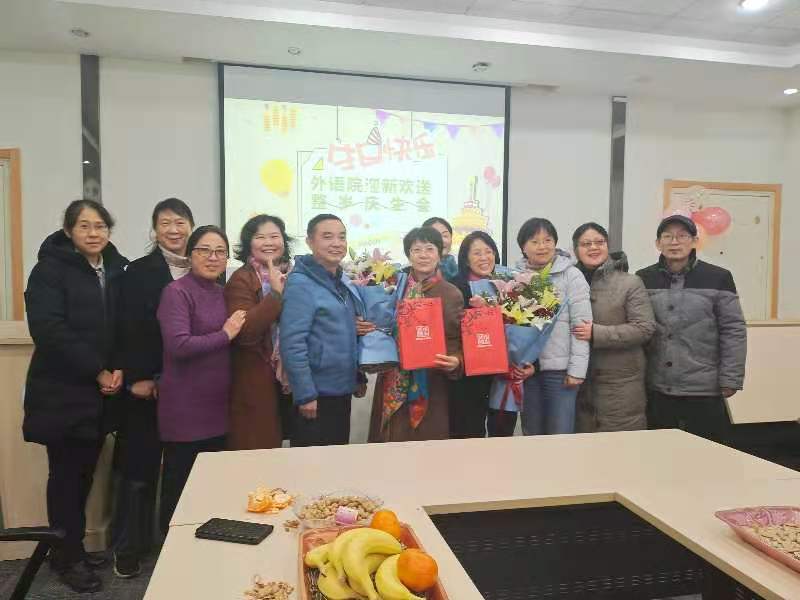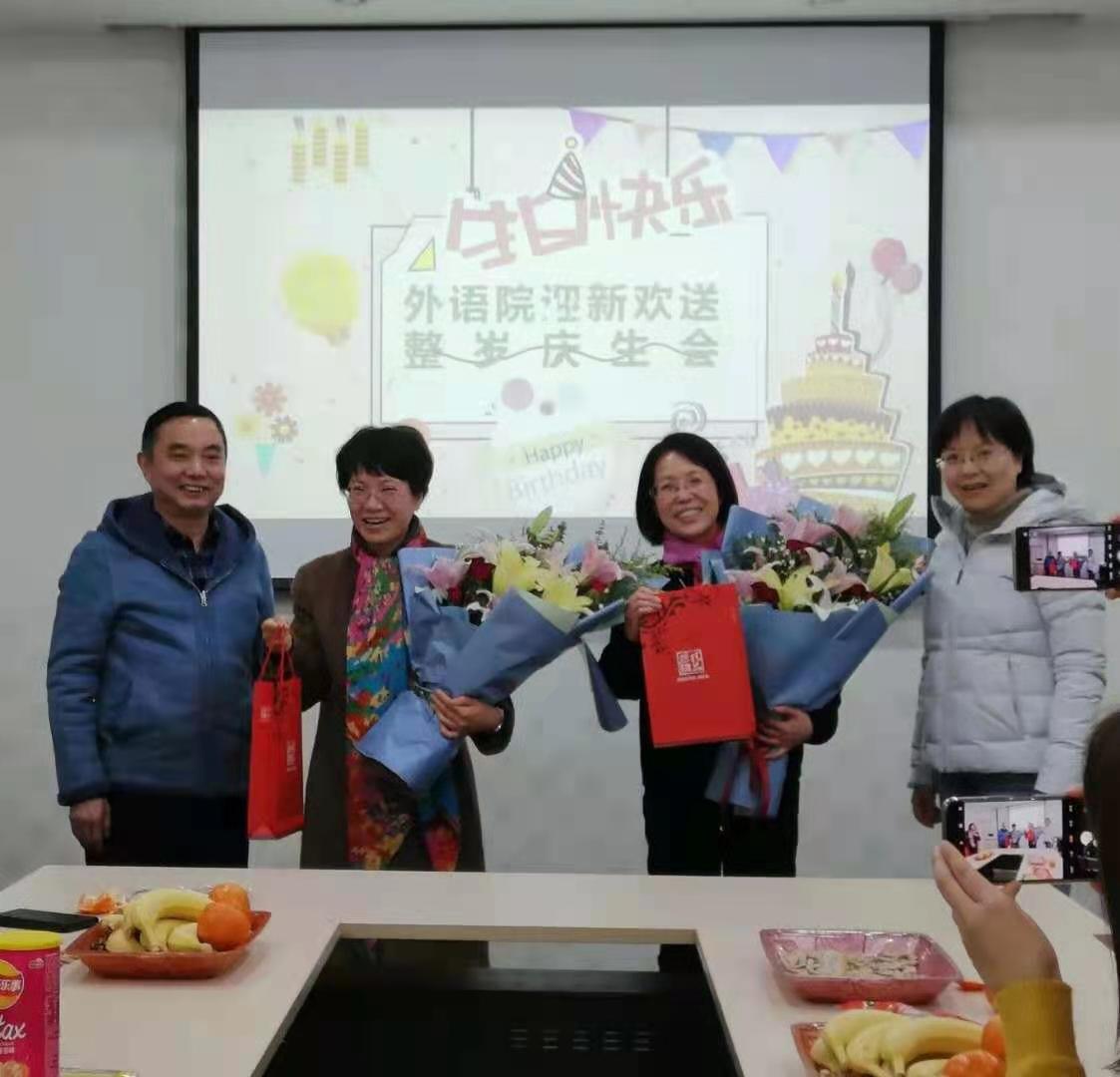工会在A310室举办2020年度教职工迎新与荣休仪式,荣休教师何淑琴、张友琴,新进教师刘雪琴、杨艳霞、秦曦、沈春花参加了仪式,同时,学院工会还为王歆、鲍彦、李维、王婷婷和许乐五位老师举办了整岁庆生会。学院党委书记朱筱玉、副院长曹新宇和游衣明分别致辞,他们对荣休老师们为学校学院做出的突出贡献表示了感谢,并对新进教师们表示了热烈欢迎。大家一同观赏学院为两位荣休教师精心制作的电子相册,共忆一起度过的美好时光,部分老师还用歌声表达了对各位老师的祝福,郭凡的《祝寿歌》高亢隽永、王歆的《友谊地久天长》情意绵长;金锦珠的《金达莱花》热情奔放、邓丽霞的《樱花》情深意切,大家同唱生日歌,品尝甜美蛋糕,深情诠释着外语一家亲。