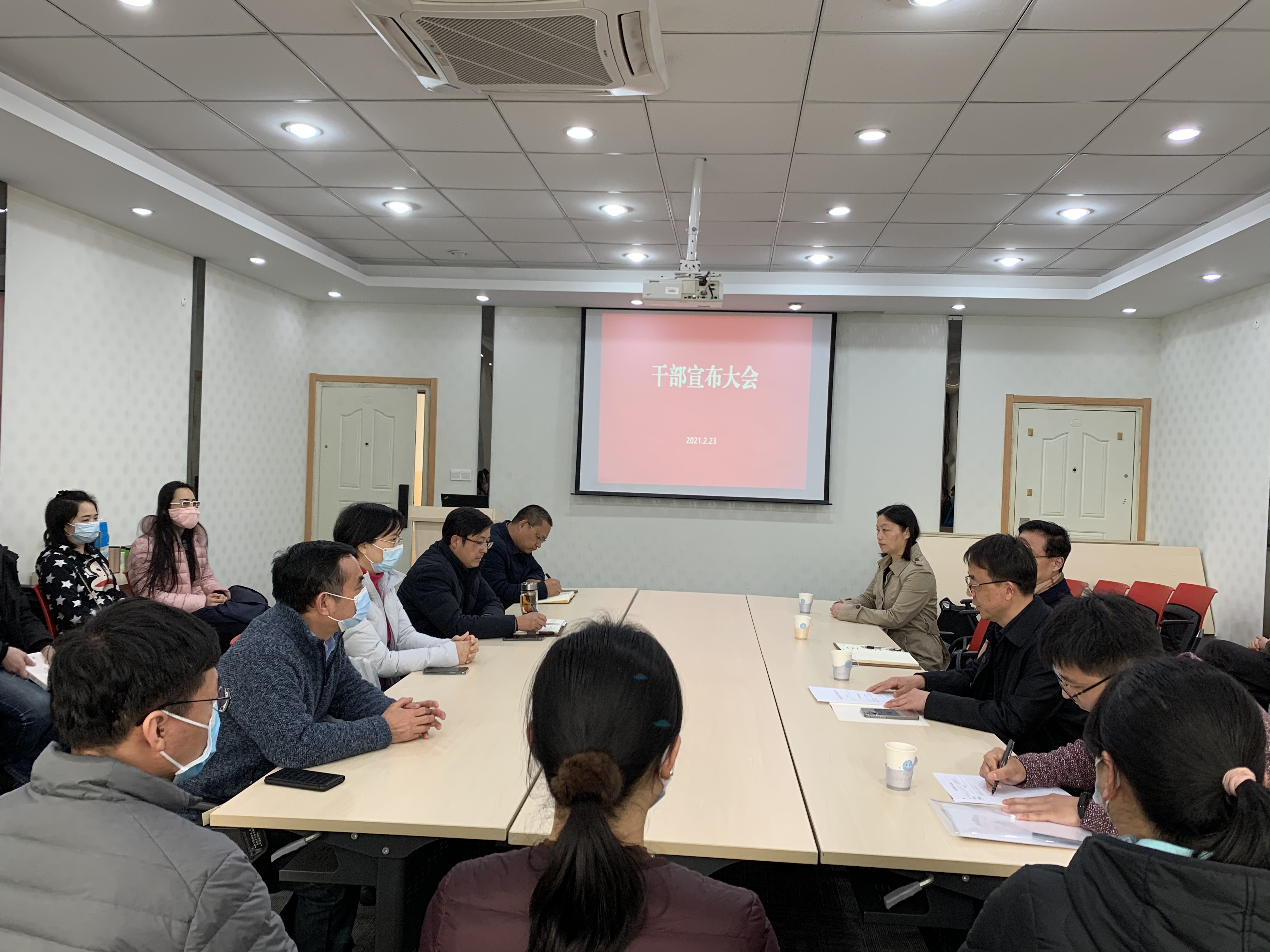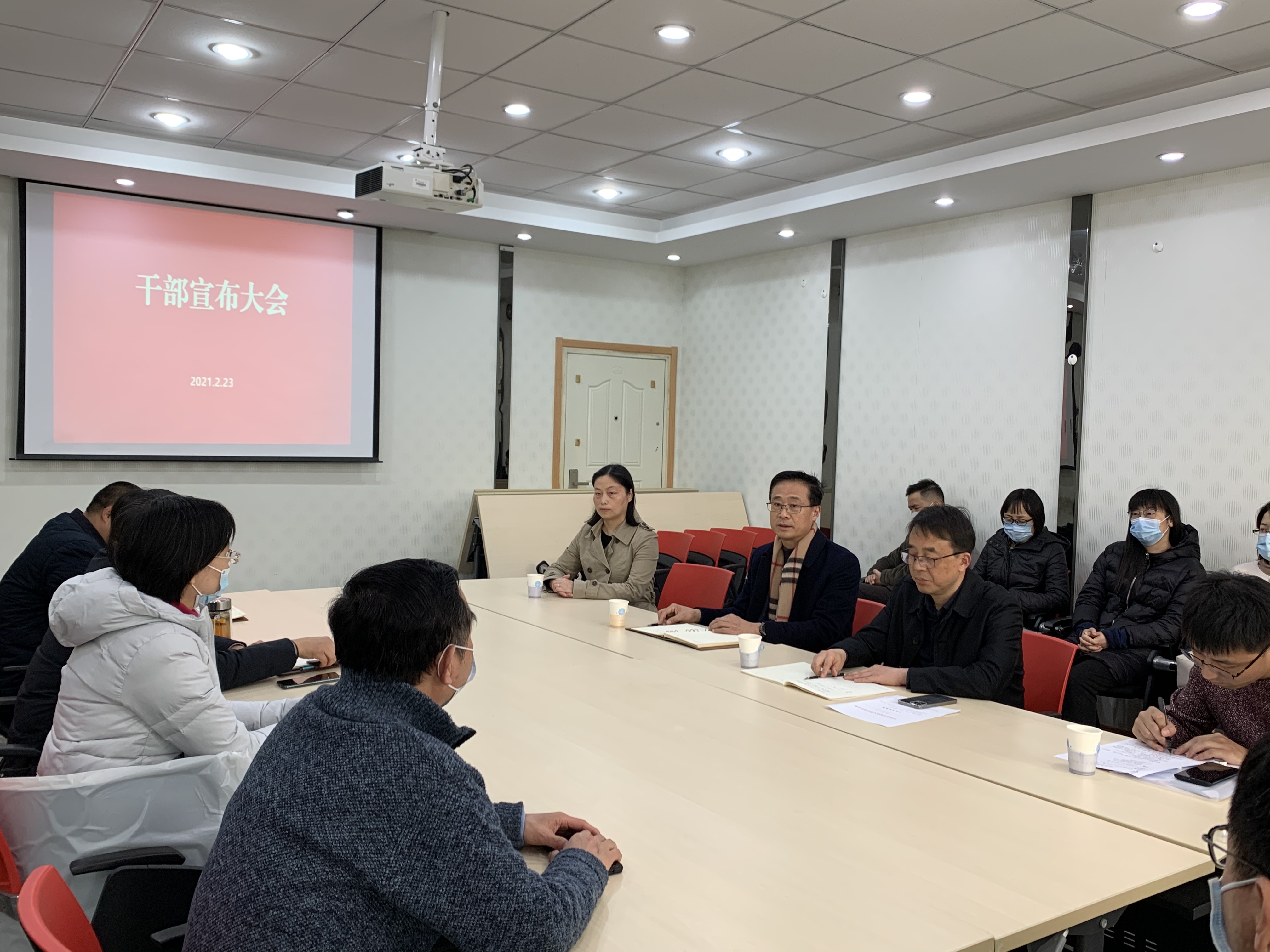 在教学楼A310会议室召开干部宣布大会。校党委常委、副校长胡锋,校党委常委、组织部部长吴群,组织部干部科科长杨海峰出席干部宣布大会。学院全体院领导、院党委委员、各系系主任、各党支部书记、教师代表以及学院行政管理人员参加了大会。干部宣布大会由吴群同志主持。