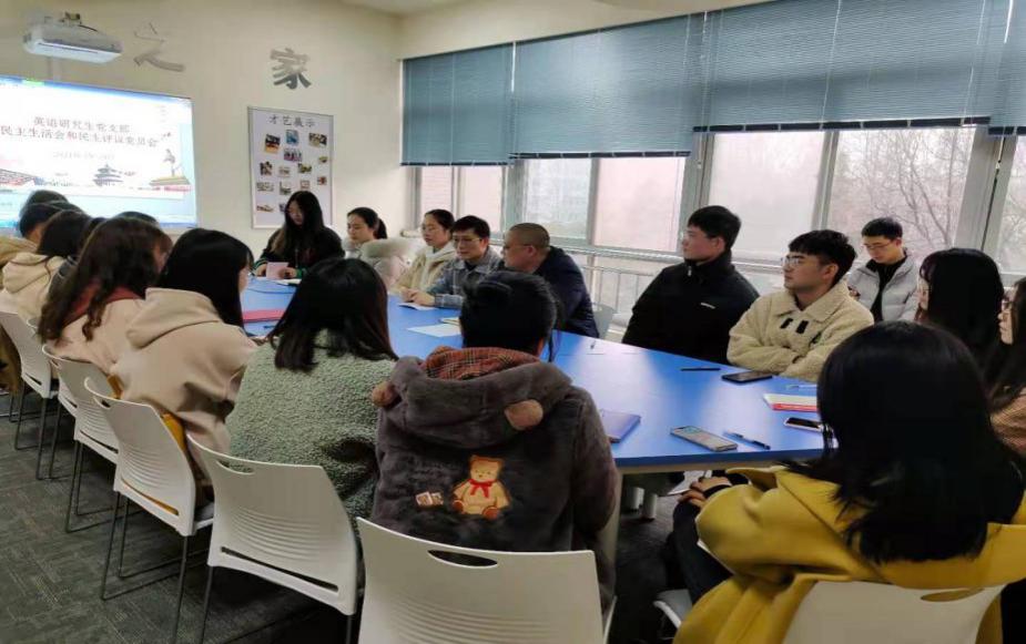 3月19日下午,英语研究生党支部在教学楼A322召开了2020年度组织生活会和民主评议党员会。会上,全体党员集体观看了《战“疫”先锋》专题片。随后,支部书记杨瑞萌向支部成员传达了2021年学校、学院党委工作要点,她号召全体成员以饱满的热情投入到建党100周年系列活动以及党史学习教育中。