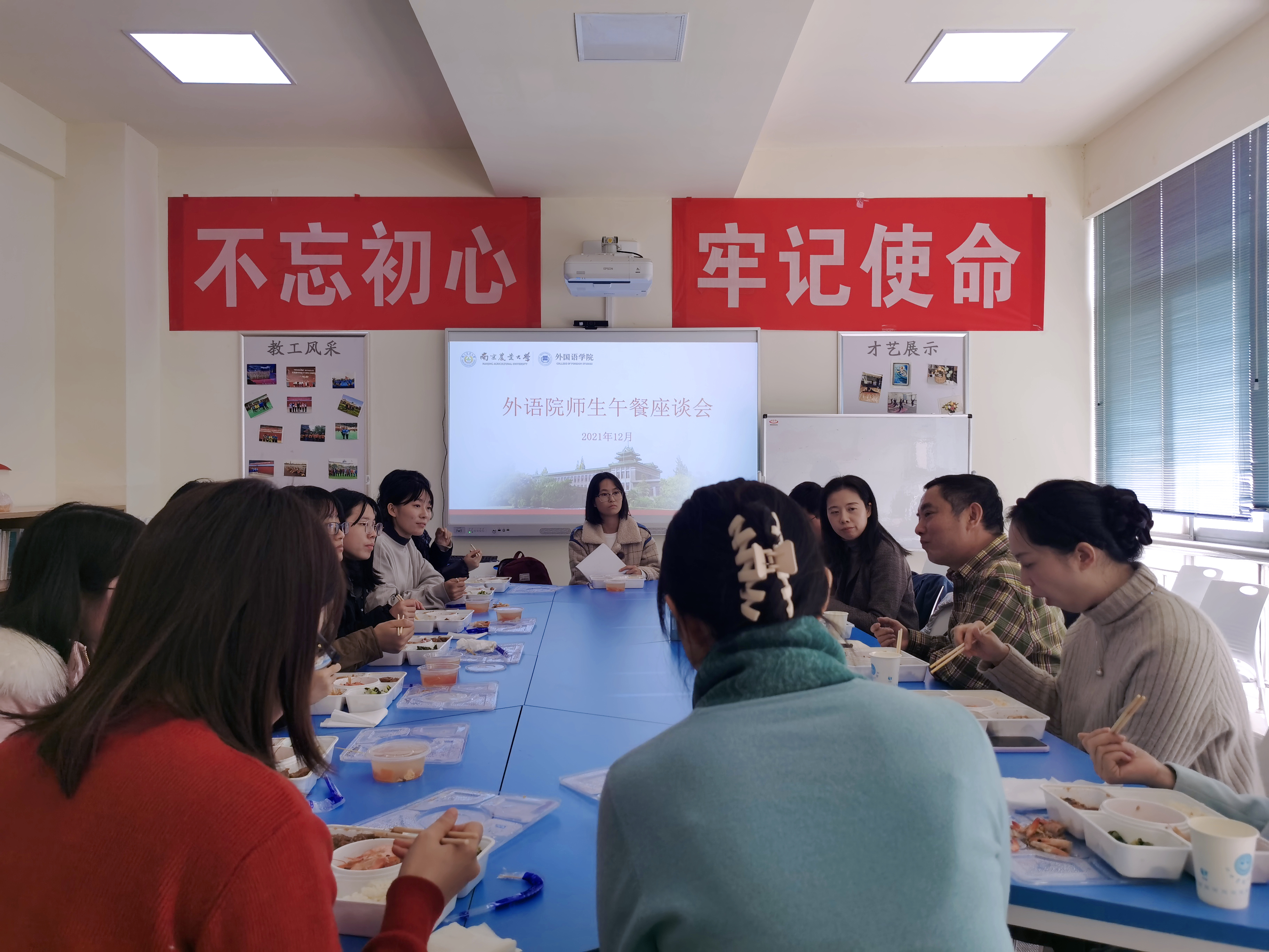 在教学楼A322举办师生午餐座谈会,副院长游衣明、英语系主任李平、日语系主任卢冬丽以及部分教师代表和学生代表参会。会议由游衣明主持。