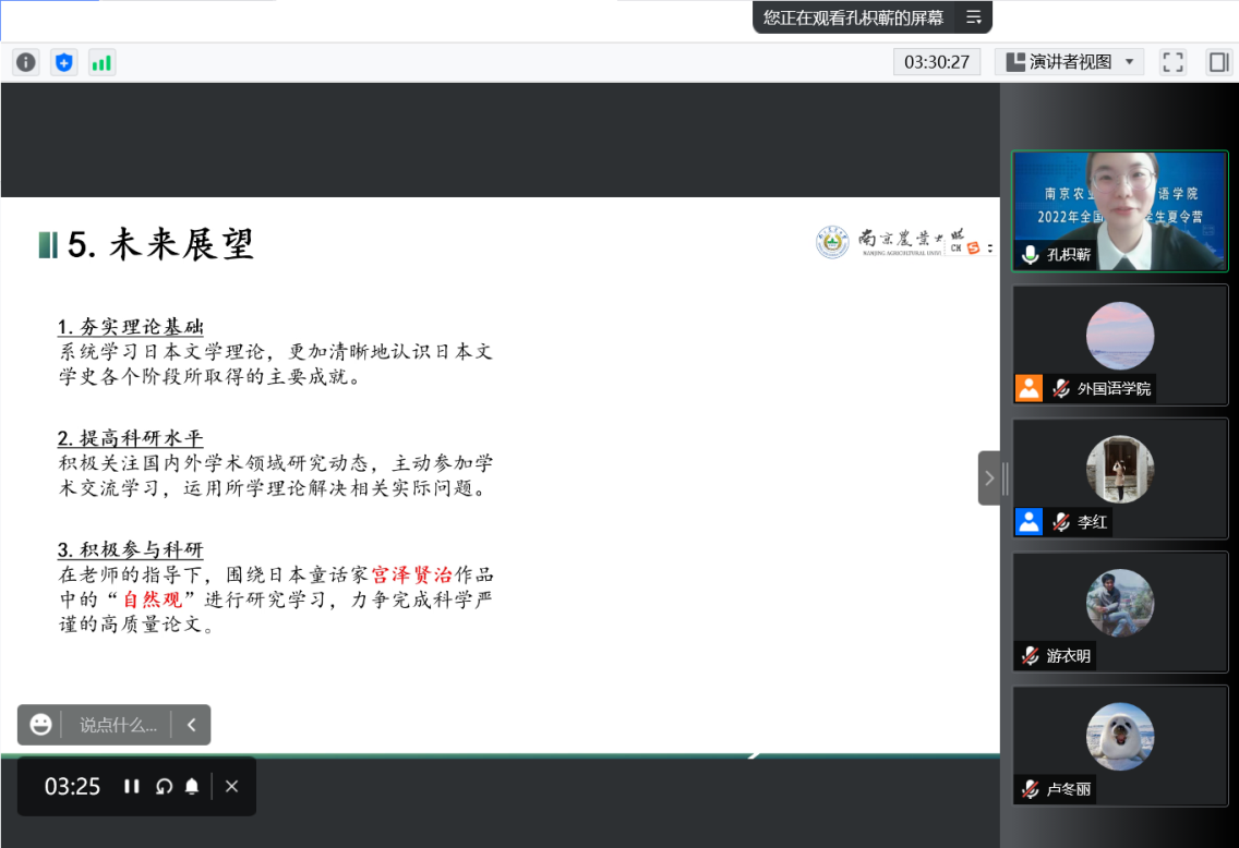 7月5日上午,英语与日语方向的硕士生导师担任评委,对营员进行了分组综合考核。营员们汇报了个人情况并提交了学术论文,回答了评委老师的提问,结合论文的研究内容、研究方法等与老师进一步探讨交流,展现了自己的外语功底、知识储备、学术素养以及书面和口头表达能力。营员们的优秀表现和综合素质,给评委老师留下了深刻印象。