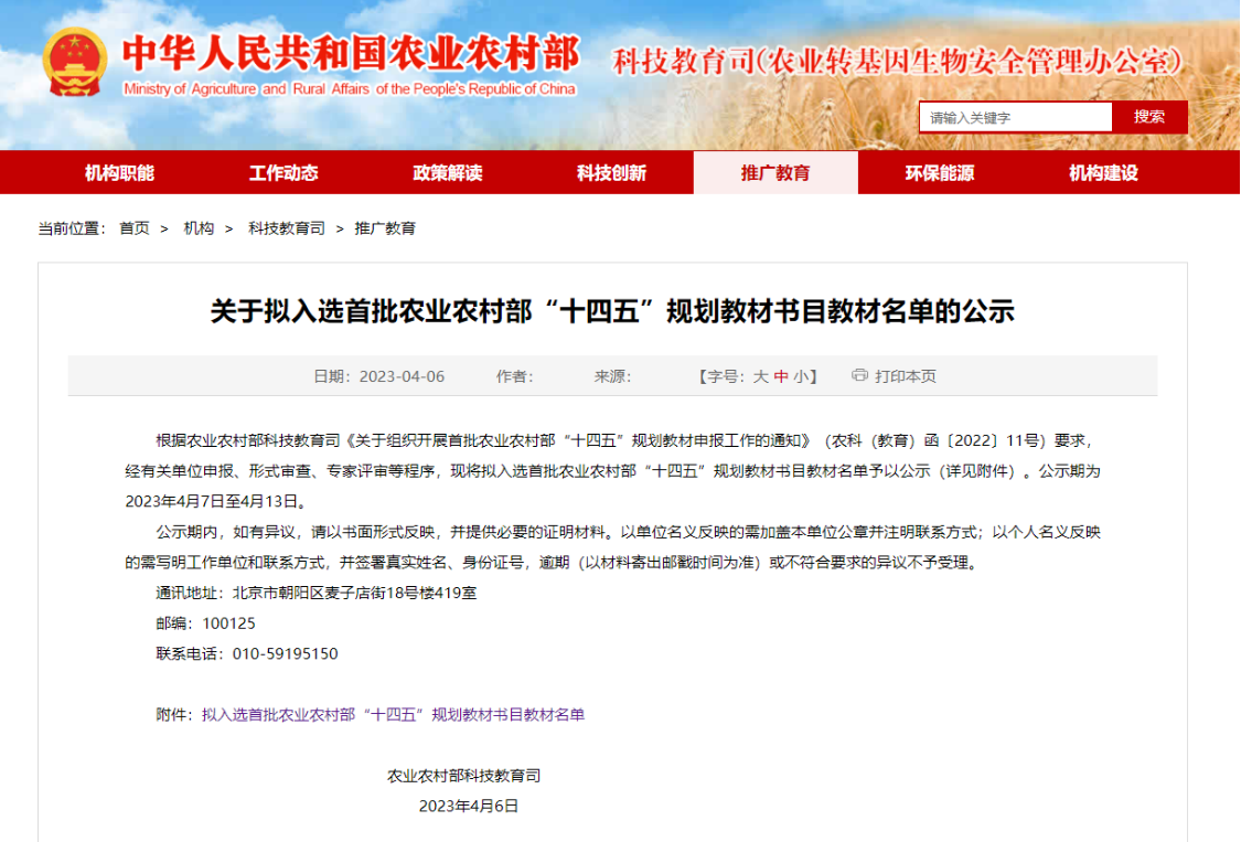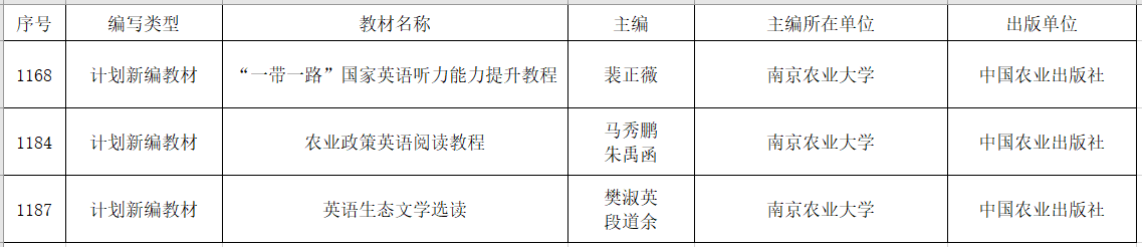 近日,农业农村部科技教育司公布了《关于拟入选首批农业农村部“十四五”规划教材书目教材名单的公示》,麻豆视频 教师团队主编的《“一带一路”国家英语听力能力提升教程》、《农业政策英语阅读教程》、《英语生态文学选读》等3部教材入选。