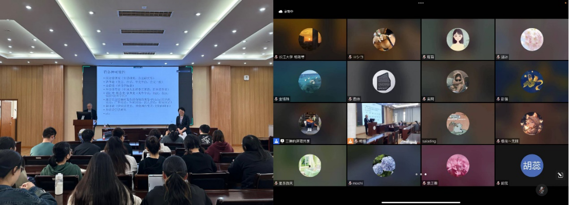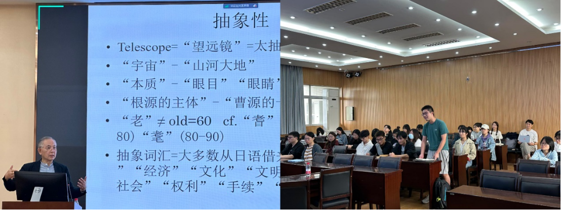 讲座中,内田庆市详细解释了文化交涉学的概念及特点,以丝绸之路、西学东渐等具体案例探讨了语言与文化之间的紧密关系。他强调汉字具有具象性、抽象性、综合性和反训的特点,提出汉语的特征即文化反映在语言中。此外,内田庆市围绕翻译问题进行深入探讨,通过中日文化翻译的差异,指出在当今世界语言文化接触过程中,要以“周边看中心”的方法进行语言文化研究。同时对比外国人和中国人汉语研究的区别,为师生介绍了今后仍需完善的汉语研究课题。讲座最后,与会同学针对当代汉语词汇与外来词的融合和混用问题进行了探讨。