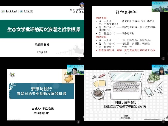 在学术讲座环节,副院长马秀鹏教授介绍了生态文学批评的两次浪潮,追溯其发展根源和历程;英语系主任李平教授介绍了林语堂真善美的翻译思想,指出要在实践中运用优秀翻译思想,并加以发展创新;日语语言文学硕士点点长李红教授分享了自己的日语学研之梦,评述了日语学科专业发展与科研路径;英语系贾雯副教授用基于自己的故事讲述了“科研,就在身边——应用语言学在教学中的实证研究”,英语系杨艳霞副教授从发展历程、技术逻辑等层面对大语言模型时代的翻译研究进行综述;日语系周萌副教授阐释了语言研究的两大范式,回顾了日语语言的语料库研究,日语系陈海涛博士围绕考试和科研两个层面讲解了日语指示词中的奥秘。