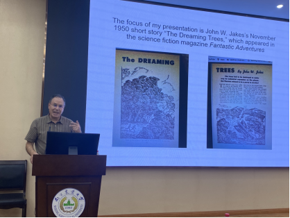 讲座伊始,斯洛维克教授以约翰·W·杰克斯(John W. Jakes)的科幻故事《梦幻树》(“The Dreaming Trees”)为切入点,结合多部跨学科著述的文本以及生态批评理论相关关键概念,深入分析了小说中“梦幻树”的多重含义,并介绍了“树木生态批评”(Arboreal Ecocriticism)这一新兴环境人文研究领域。随着环境科学研究的不断深入,对于树木可能拥有感知能力的新观念逐渐深入人心。相关发现正在改变着人们对待自然的看法,促使我们重新认知人类和自然之间的关系。树木生态批评专注于树木与人类智能、感知、社会生活等之间的关系,强调超越人类中心视角,以平等、客观的态度面对自然、尊重自然,与当下中国倡导的生态文明建设及人类命运共同体理念相契合。随后,斯洛维克教授对多部该领域最新研究专著进行了详细介绍,进一步加深了师生对生态研究前沿动向的了解。