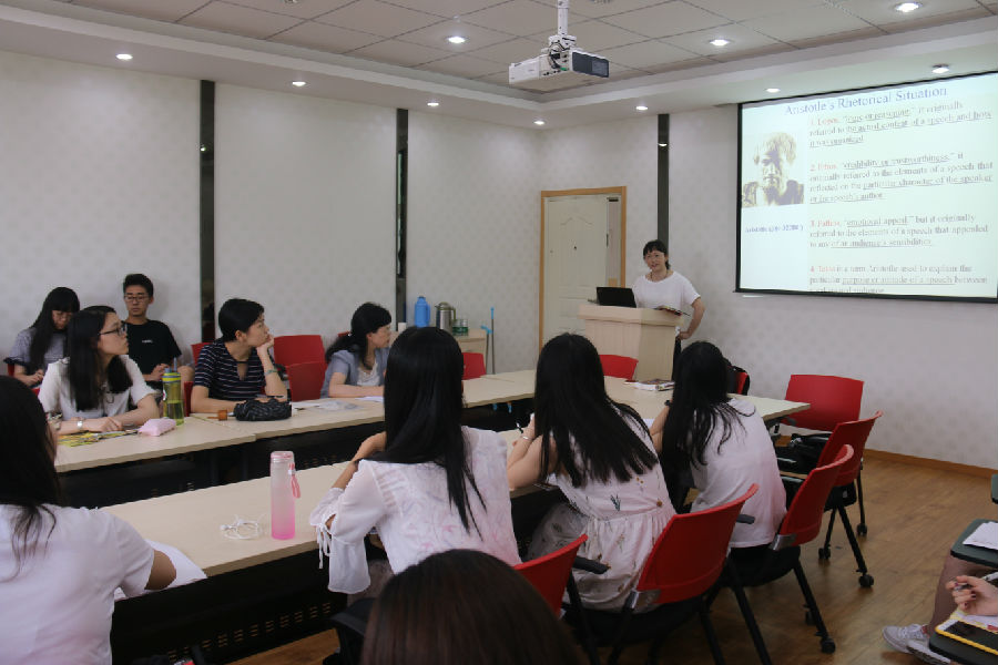 讲座伊始,顾明生老师详细介绍了rhetorical situation(修辞情境)的相关知识,并详细分析了亚里斯多德的修辞情境。随后,顾老师以修辞情境为切入点,结合同学们事先阅读的“Lord of the Mountains”、“Faithful Isaac”等《汉语世界》中的三篇有关“一带一路”的文章,为同学们介绍了讲述中国故事的方法,并引导同学们体会写作的目的和写作受众者的重要性。顾老师着重指出三篇文章中需要注意的词句并引导同学们做出自己的理解。顾老师还根据文章作者国籍的差异带领同学们比较中外作者写作语言的不同,启发同学们根据文章作者不同的国别发现中外作者的语言、态度、讲述方式的差异。
