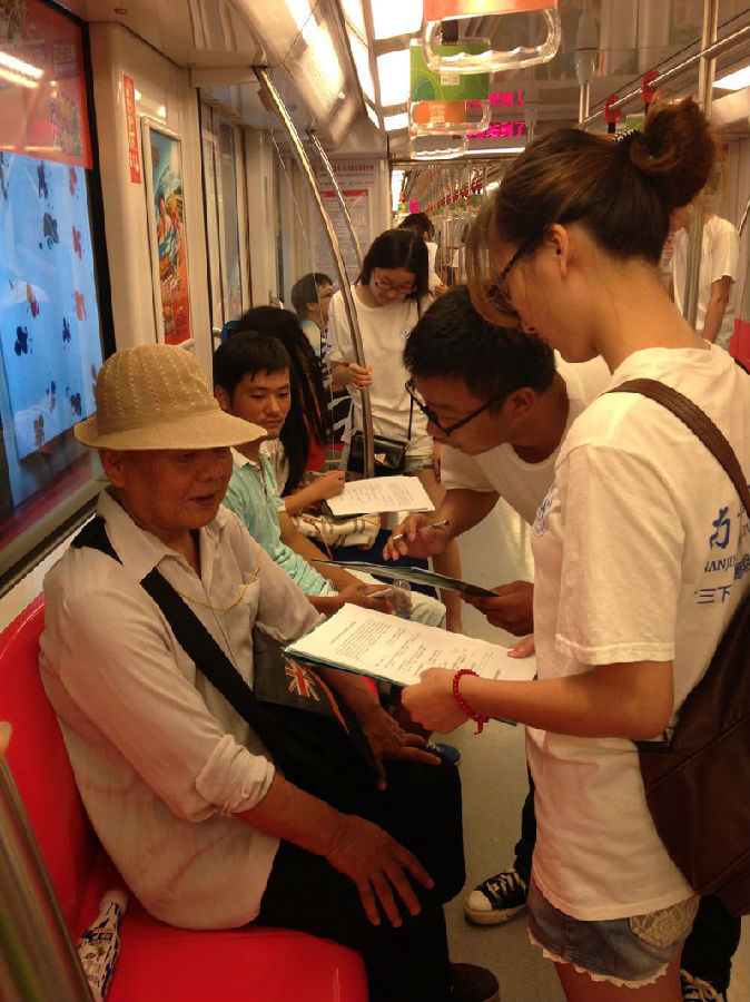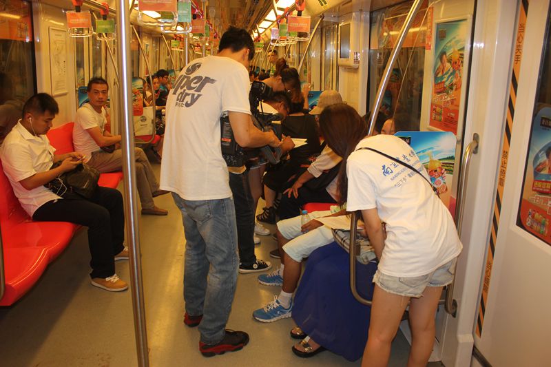 为了迎接南京青奥会,提升南京城市形象和市民素质,保障南京地铁文明安全运营,我们“青春吾爱志愿吾心”暑期社会实践团携手南京电视台《直播南京》“蓝鲸行动”开展“青奥礼赞,文明地铁”调研活动。2014年7月21日我们暑期实践团早早出发,来到地铁2号线,以西安门站为起点,经天路为终点,展开了以南京地铁禁食为主题的问卷调查和纠正不文明坐姿等行为的活动。