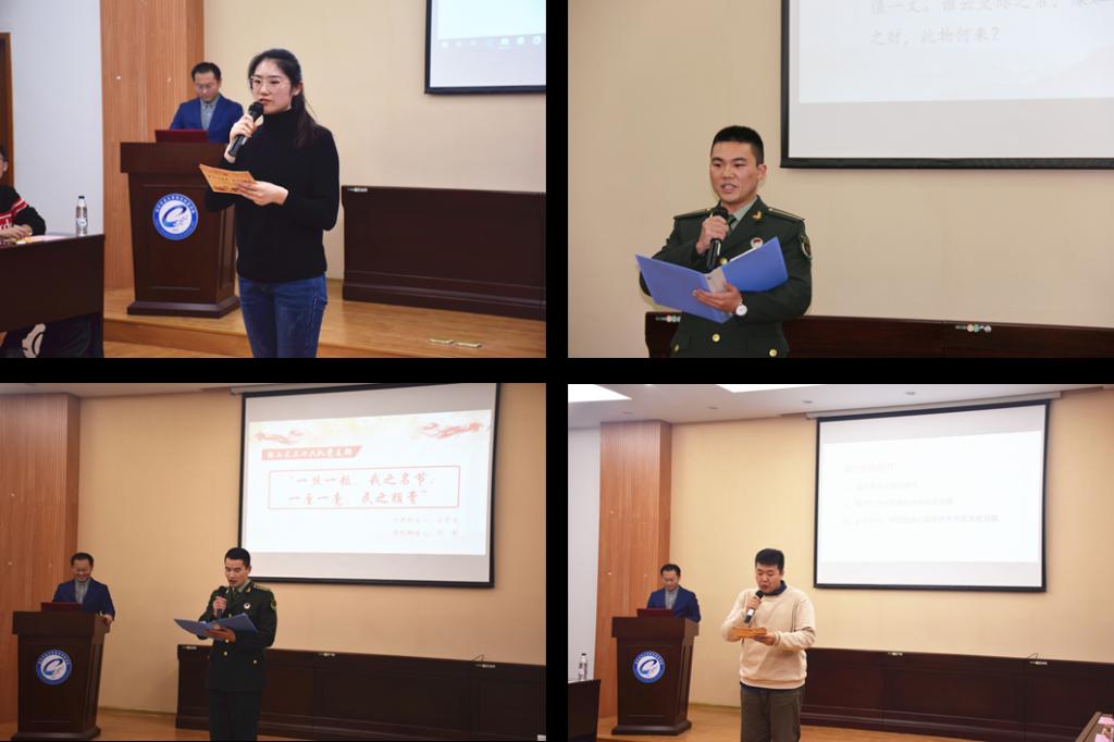 和陆工大四个学生支部分别围绕“民生”、“家风”“劝学”“廉政”展开汇报。英语本科生党支部的刘晨韵和徐婷婷同志通过对“一枝一叶总关情”的经典释义和思想解读全面阐释了习近平总书记以人民为中心的发展思想。日语本科生党支部的陆艳和肖书彤同志以石碏谏卫庄公的故事诠释了“爱子,教之以义方”内涵,并强调了家庭教育的重要性。英语和日语研究生党支部的刘维杉和徐畅同志深挖“独学而无友,则孤陋而寡闻”,提出了“与其联机游戏,不如集思广益”的倡议,并深刻解读了当代青年应该“读什么样的书”。陆军工程大学三十六队党支部肖有效和刘薪同志借“一丝一粒,我之名节;一厘一毫,民之脂膏”原典作者张伯行的事迹,铿锵有力地阐释了廉政的内涵,并提出党员同志要脚踏实地,保持谦虚谨慎的心态。