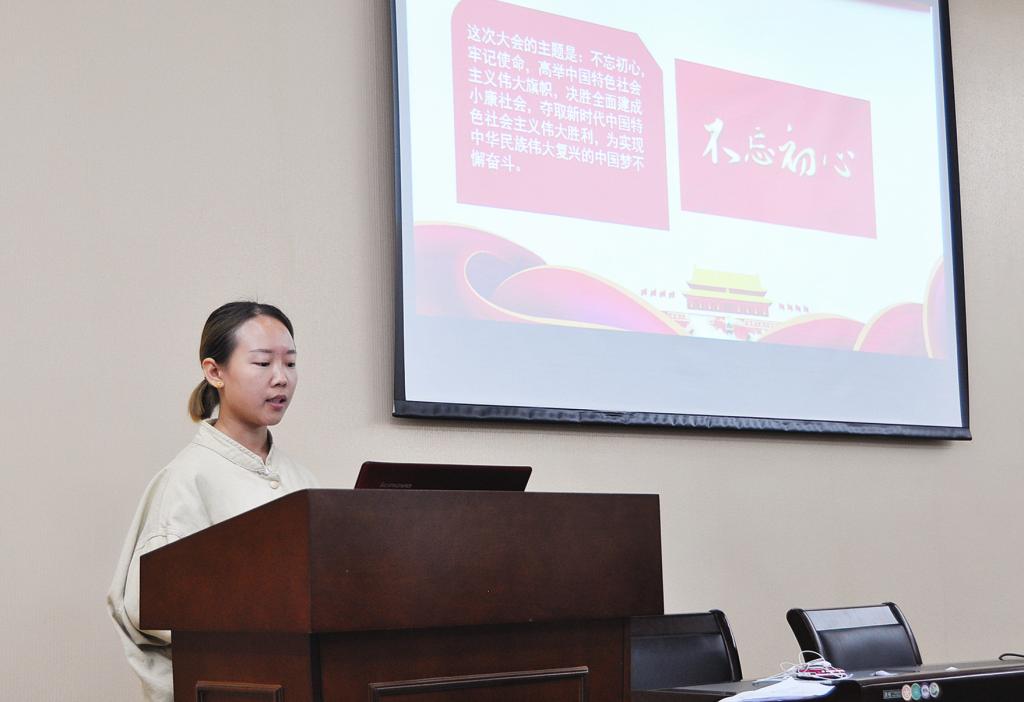党代会学习汇报小组向全体新发展党员介绍了党代会的基本信息,并着重介绍了第十九届党代会,及其五项议程的相关内容。并指出党员同志要从真学真用习近平总书记特色理念到坚持理想信念、保持赤子心,再到脚踏实地,知行合一,做好本职工作,并将党的十九大精神落实到日常的学习生活工作中去。